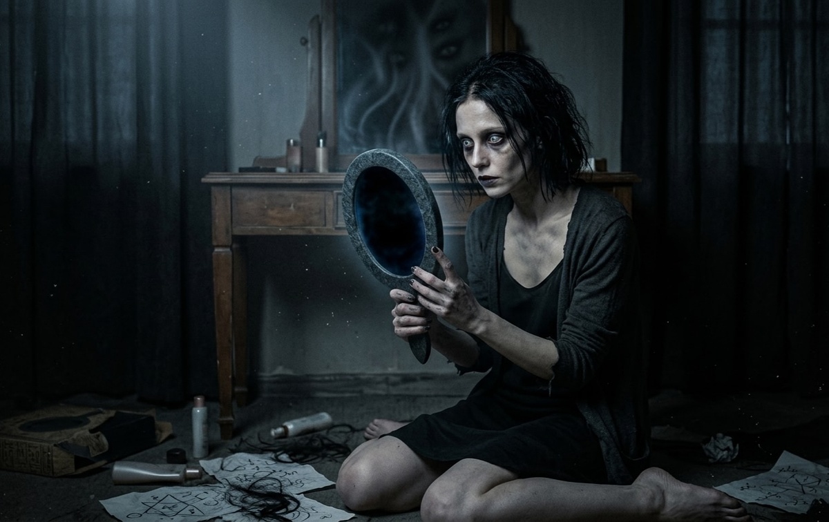 Через неделю квартира изменилась. Зина заклеила все зеркала в доме черной бумагой, оставив только обсидиановый диск. Она перестала мыться, утверждая, что вода «стирает её истинное лицо». Её кожа приобрела нездоровый, сероватый оттенок, а под глазами залегли тени, похожие на кровоподтеки.