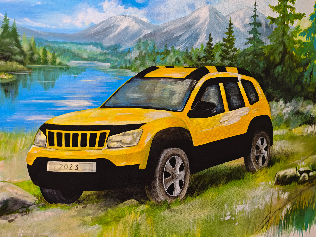 Всем привет! Мне очень приятно, что жёлтый Дастер теперь красуется на стене в автосервисе БМ Сервис на Воздухоплавательной 11). Художник сначала нарисовал без птф и порогов, потом устранили недочёт).