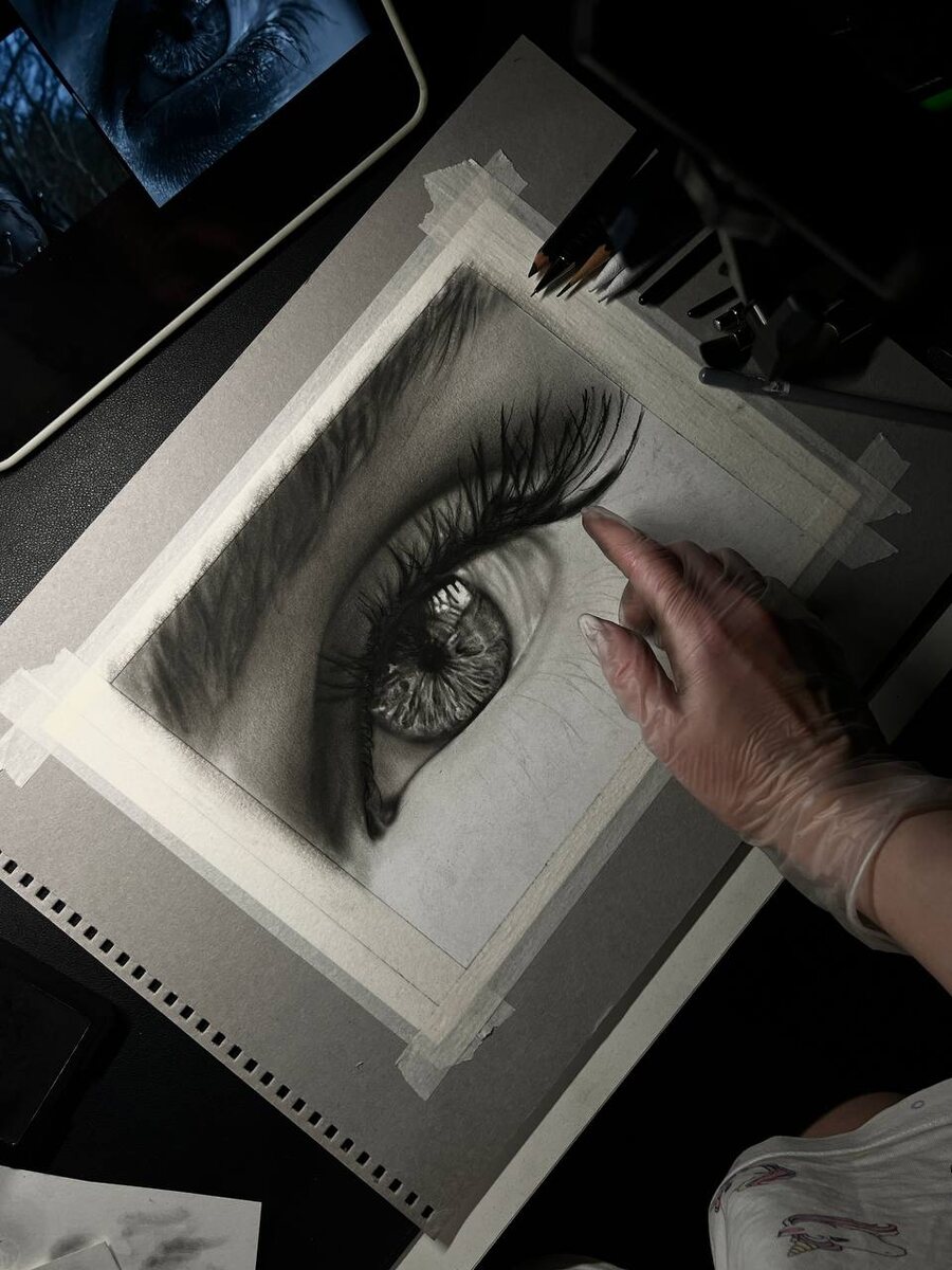 Как то так…👀 процесс рисования глаза… Прививаю себе терпение с угольной пудрой. Хотела бы сказать что половина работы готова, но даже та часть которая уже есть - сделана только на 50% 😆 Формат больше - деталей тоже больше оказывается))