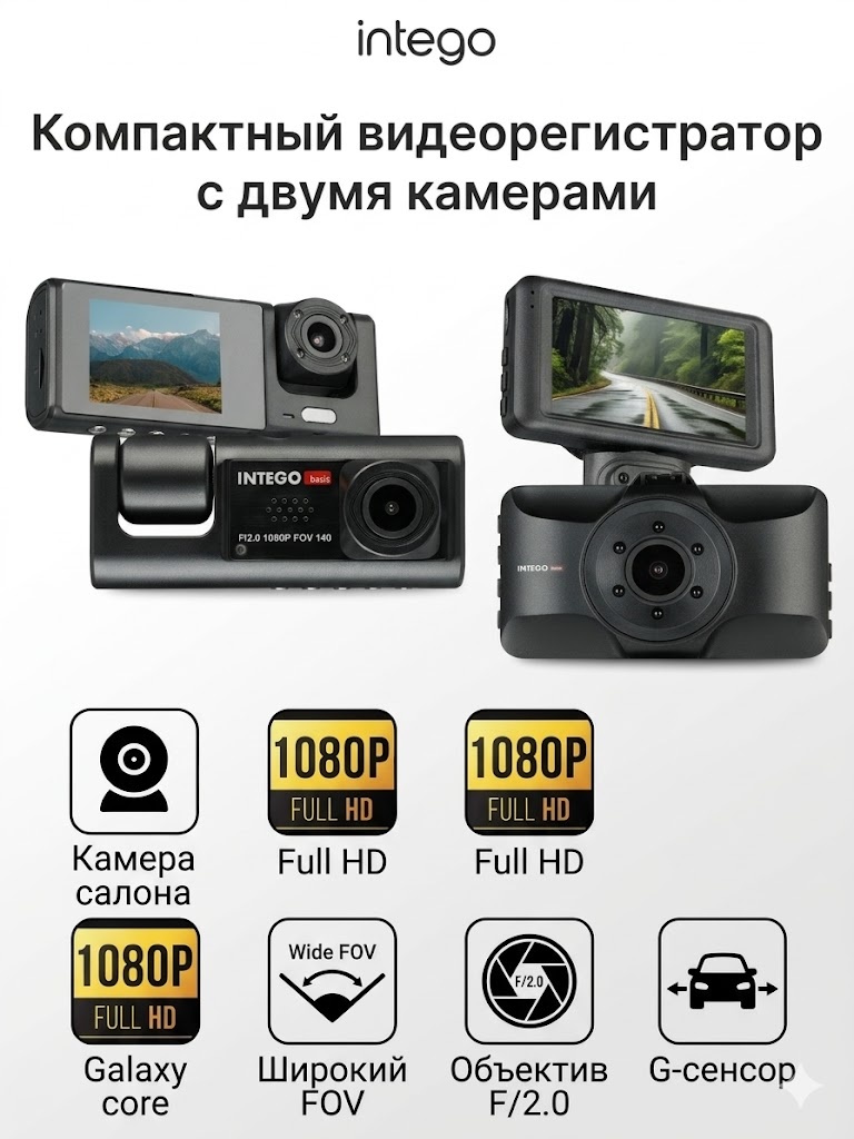 INTEGO Basic VX-333DUAL с салонной камерой — это регистратор, который делает ставку на чёткость и предсказуемость. Именно то, что нужно водителю, который хочет один раз настроить и забыть.