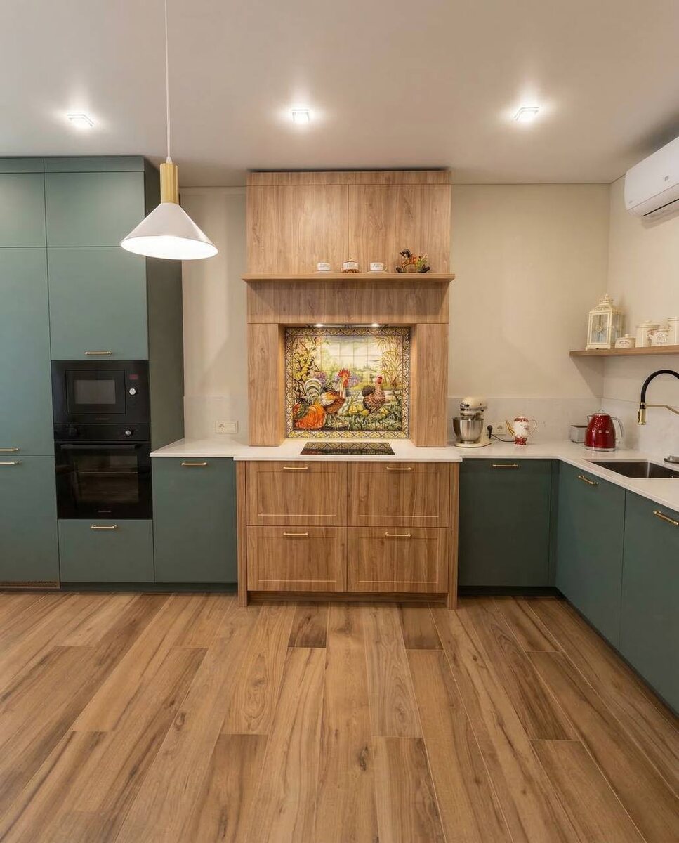 Эта кухня — проект для нашего клиента Андрея из Самары, выполненный в уникальном стиле «а-ля рус» (à la russe), который черпает вдохновение в русской культуре. 💫 Тёплые оттенки, натуральные материалы, изысканные декоративные детали и, конечно же, художественная роспись — всё это создаёт атмосферу уюта и связи с народными традициями. 🏡💖 И в центре внимания — керамика! Для кухни Андрея мы создали яркое расписное панно для фартука, на котором изображён живой птичий двор: петухи, курочки и деревенские мотивы. 🌸🐔 Это панно превращает кухню в настоящий уголок русского подворья, наполняя пространство теплом и характером. 🔥 Такая керамика — это не просто элемент декора, а центральный акцент и произведение искусства, которое подчеркивает душевность и уникальность Тел.: WhatsApp/Telegram: +7 926 316-69-87