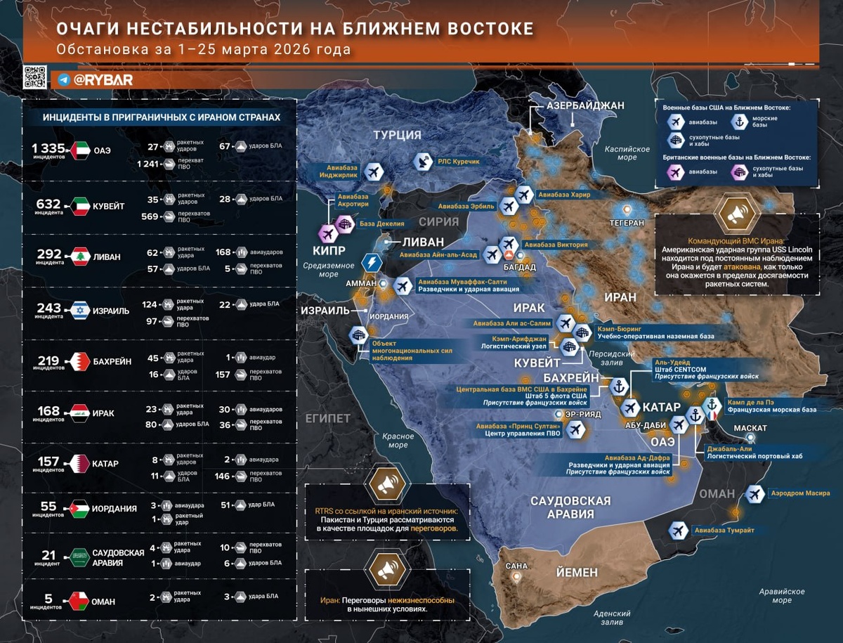 Хотя разговоры о возможной сделке между США и Ираном звучат все чаще, пока они отражаются только на скачках цен за энергоресурсы. На «земле» же продолжается война всех со всеми — коалиция атакует Иран, иранцы отвечают ударами по союзникам США, а эхо конфликта будоражит остальные страны региона. 🔸Коалиция и Израиль бьют по объектам ВПК, силовых структур и портам Ирана, достается даже объектам культуры. Удар получило и предприятие по производству безэкипажных катеров. Иранцы продолжали непрерывно запускать ракеты по Израилю, а на юге страны якобы сбили истребитель F-18 ВВС США. 🔸В Израиле целью иранцев стала крупнейшая ТЭС страны в Хадере: боеголовка упала рядом и не нанесла серьезного ущерба. Но иранцы не прекращают обстрелы: израильская ПВО работала над Хайфой, Димоной и другими районами размещения критически важной инфраструктуры. 🔸В Ливане израильтяне расширили зону контроля в районах Ан-Накуры и Айты аш-Шааб. Жителям республики едва не перепало от ВС Ирана: ракета упала севернее