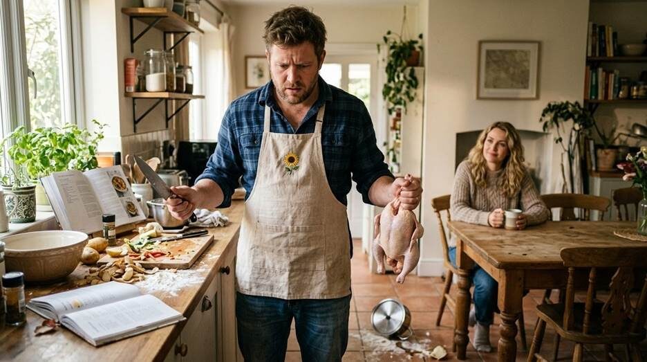 Он надел её фартук, бежевый, с вышитым подсолнухом на кармашке. Завязки не сошлись на спине. Костя заткнул их за пояс джинсов: широкие плечи, куриная тушка в одной руке, нож в другой, и фартук, который сидел на нём как жилетка на медведе. Лида пила кофе и смотрела, но смеяться не стала.