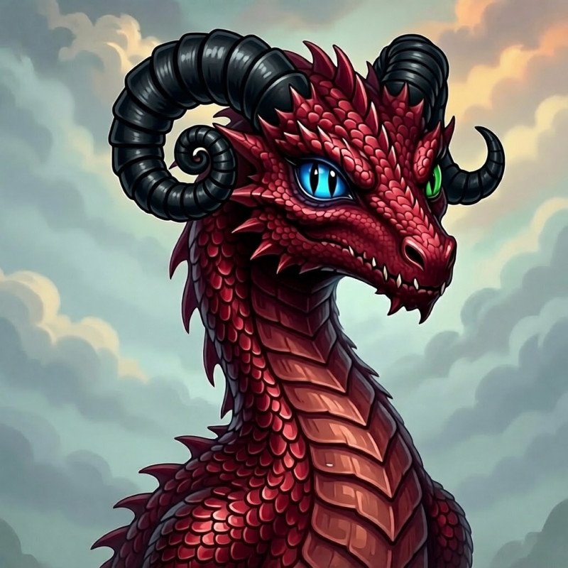 Чешуя его была как черепица. Жёсткие находящей друг на друга чешуйки, ярко бордовые с коричневыми краями. А вместо классического гребня на голове — закрученные спиралью бараньи рога маслянисто-черного цвета.