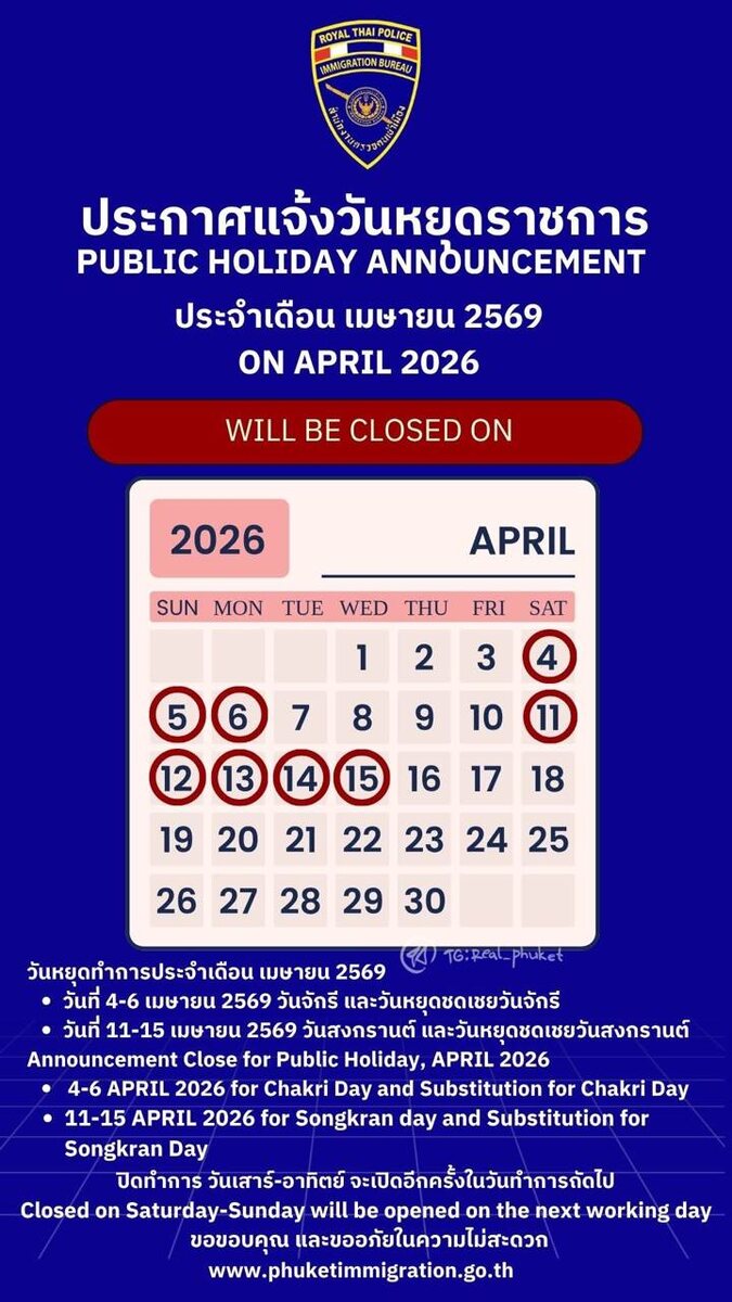 4–6 апреля: День династии Чакри и дополнительный выходной в честь Дня Чакри 11–15 апреля: Сонгкран (Тайский Новый год) и дополнительные выходные дни в честь Сонгкрана. В указанные будут так же закрыты все государственные ведомства и банки. Поэтому планируйте все дела заранее. @real_phuket