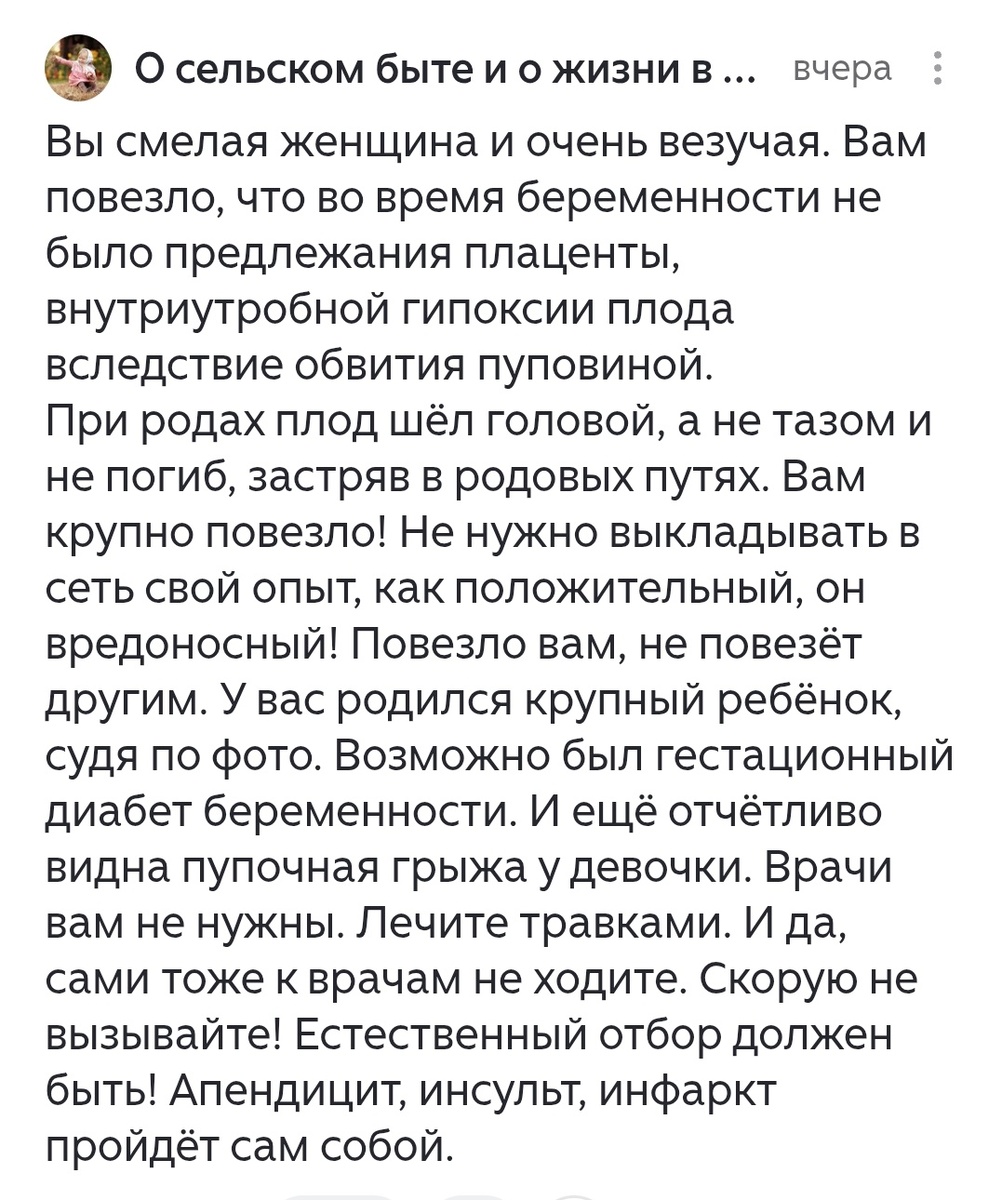 И опыт медицинских родов у меня, кстати, тоже имеется, в количестве двух штук. Очень болезненный, с различными вмешательствами и неадекватностью медперсонала. С разрывами, маститом, желтушкой у детей. Тоже могу поделиться, с подробностями. Этот опыт вредоносен или нет, как думаете? Или ой, это другое?