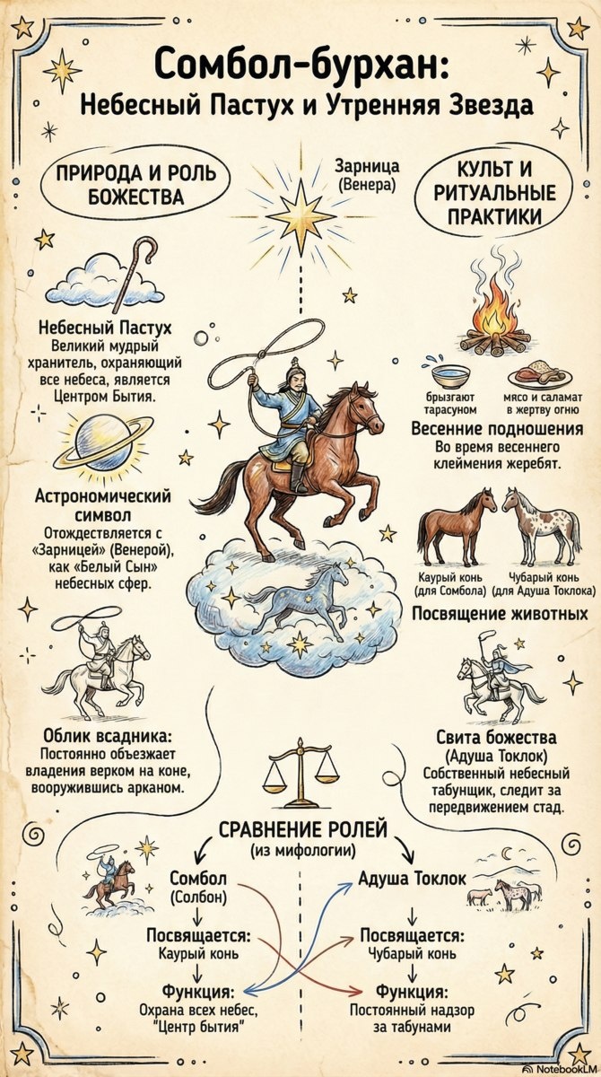 Сомбол-бурхан (Солбон) — великий мудрый хранитель, охраняющий все небеса. В мифологии он считается «Центром Бытия» и астрономически отождествляется с «Зарницей» (планетой Венера), выступая как «Белый Сын» небесных сфер. Его представляют в облике всадника, который постоянно объезжает свои владения верхом на коне, вооружившись арканом. Культ и ритуалы: Ему посвящается каурый конь. Весенние подношения Сомбол-бурхану совершаются во время клеймения жеребят: в жертву огню приносят мясо и саламат, брызгают тарасуном. В свите божества находится Адуша Токлок — собственный небесный табунщик, который следит за передвижением стад. Ему посвящается чубарый конь. Если Сомбол отвечает за общую охрану небес, то Адуша Токлок осуществляет постоянный надзор за табунами на земле. Канал нашей студии https://t.me/chimitdorzhi_studio