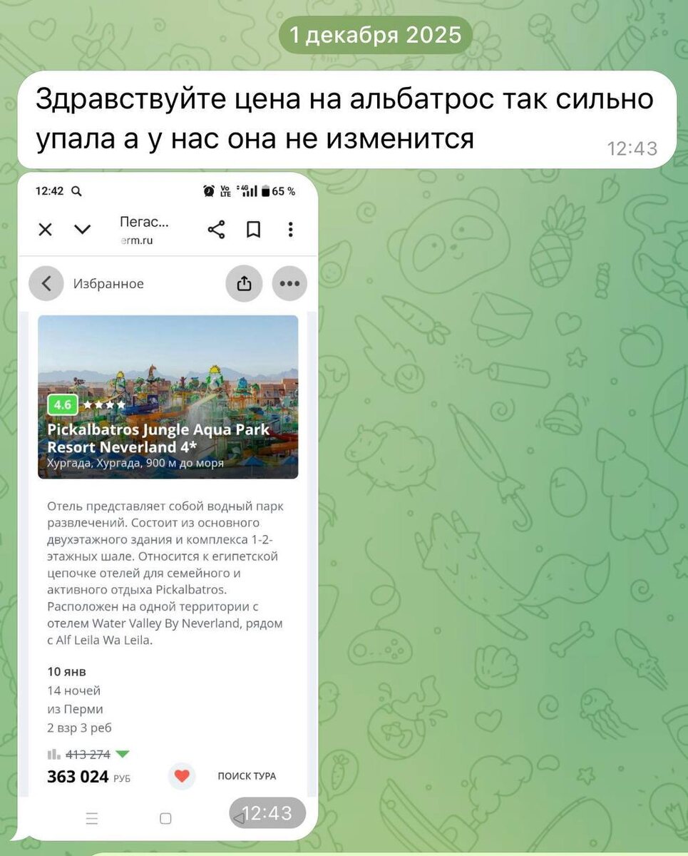 С Хеппи эндом Тур для семьи с тремя детьми. Я всегда с трепетом отношусь к подбору тура для семей с детьми, у меня у самой двое, и я знаю как хочется свозить детей на море, показать мир, оздоровить их, сколько нюансов нужно учесть, и знаю цены на туры… иногда суммы вызывают дрожь по коже и полное отчаяние… А если в семье трое детей - хочется обнять и поплакать вместе с ними 😭 Ситуация: Забронировали комбинированный тур за 400 тыс. Неделя в 5* хорошем дорогом отеле, и неделя в бюджетом отеле 4* с возможностью выйти погулять. Сделано это было для того, чтобы тур был дешевле. 2 недели в дорогом отеле сильно било по семейному бюджету. Долго выбирали, чтобы аквапарк был, бассейны, анимация… и питание хорошее, разнообразное…. чтобы от отдыха остались только теплые воспоминания. Через две недели турист пишет: цена упала… Озвучиваю условия, размер штрафа (он был мизерный в сравнении с экономией). Аннулируем, заводим новый! Через неделю снова: цена упала! Снова штраф, снова аннуляция и н