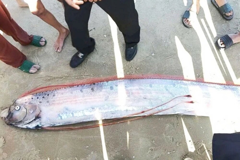 В одном из прибрежных районов Вьетнама местные жители обнаружили необычную находку — на берег выбросило сельдяного короля длиной около четырех метров. Как сообщает издание Vietnam.vn, рыбу нашли 22 марта в районе Динь-тхай-тхим. Серебристое тело с ярким красным плавником сразу привлекло внимание туристов и местных жителей. Люди подходили ближе, фотографировали находку и обсуждали редкость такого явления. Эти рыбы обитают на значительной глубине, поэтому их появление у берега случается крайне редко. Сельдяной король считается одной из самых необычных рыб Мирового океана. У него длинное, вытянутое тело, напоминающее змею, а его длина может достигать 11 метров. Иногда встречаются сообщения и о более крупных особях — до 15 метров, хотя такие данные не подтверждены. Большую часть жизни эта рыба проводит на глубине свыше 900 метров, поэтому ученые редко наблюдают ее в естественной среде. Именно из-за редких появлений у поверхности в разных культурах сельдяного короля связывают с предвестника