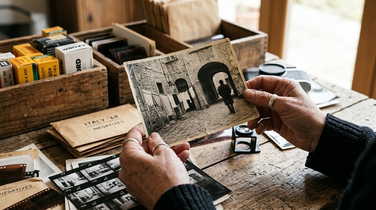 Они работали вдвоём – Нина разбирала конверты по годам, Виктор доставал плёнки и проверял контактные листы через лупу. Говорили мало. Иногда он называл ей дату и описывал кадр – короткими фразами, без лишнего. Она кивала или говорила «отложите».