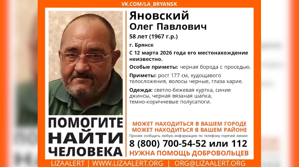 Волонтеры организации призывают жителей Брянска и области быть внимательными и помогать в установлении местонахождения пропавшего. Любая информация о местоположении мужчины может оказаться невероятно важной. В Брянске продолжается поиск 58-летнего Олега Яновского, который пропал 12 марта. С того дня о его местонахождении ничего не известно. К поискам подключились полиция и добровольцы поисково-спасательного отряда «ЛизаАлерт». Приметы пропавшего: рост 177 сантиметров, худощавое телосложение, черные волосы, карие глаза. В день исчезновения он был одет в светло-бежевую куртку, синие джинсы, черную шапку и темно-коричневые полусапоги. Волонтеры просят всех, кто может обладать информацией о местонахождении мужчины, сообщить по телефонам: 8 800 700 54 52 (горячая линия «ЛизаАлерт») или 112. Поиски продолжаются. Любая информация может помочь в установлении местонахождения пропавшего. В Брянске и области объявлен сбор волонтеров для участия в поисковых мероприятиях. Ранее стало известно, что