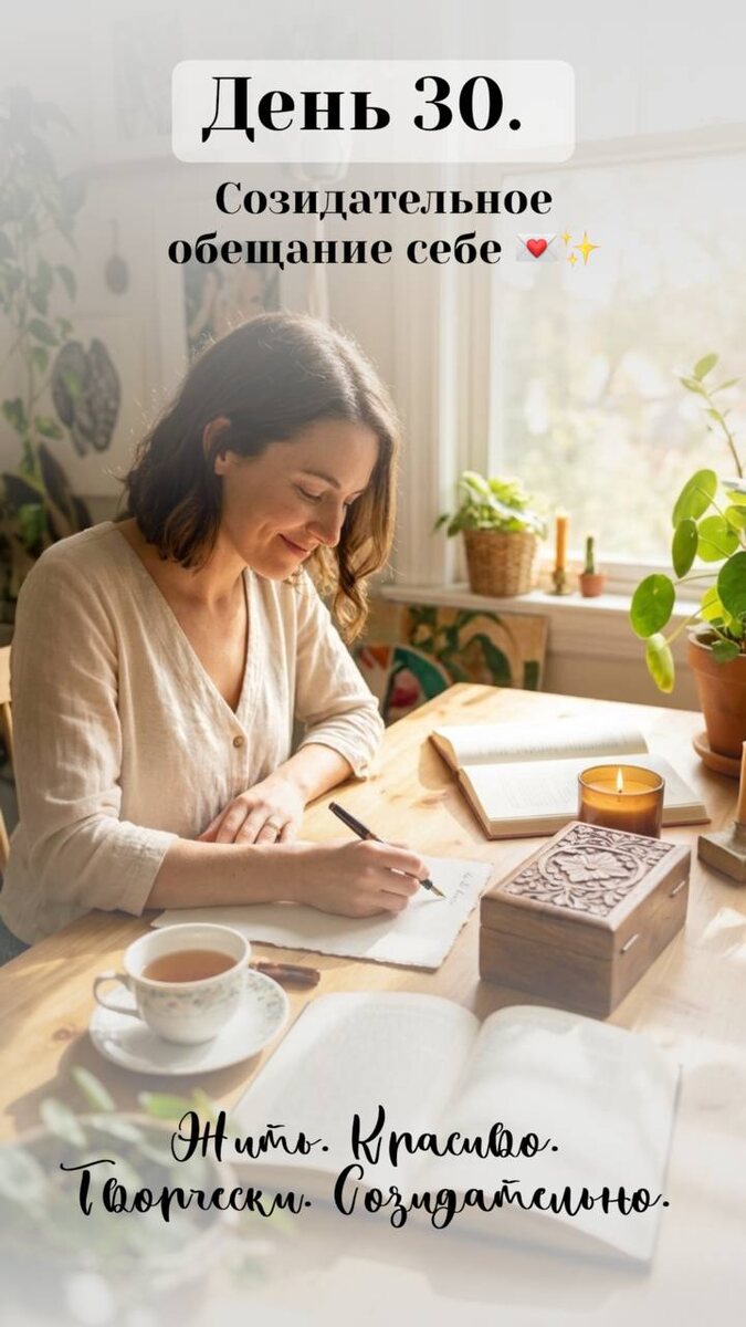 Красиво. Творчески. Созидательно.» ✨ 30 шагов к жизни, от которой не хочется отвлекаться День 3️⃣0️⃣. Созидательное обещание себе 💌✨ Тридцать дней. Тридцать маленьких шагов к себе. Тридцать ключиков, которые открывали двери в разные комнаты твоей души. Мы шли не спеша, в своём темпе, иногда задерживаясь, иногда перепрыгивая, иногда возвращаясь. Главное — мы были здесь. Ты была здесь. 🌿 Сегодня — последний день нашего путешествия. Но не финиш. Это — начало. И у нас есть особенный ритуал, чтобы закрепить этот новый путь. Напиши себе письмо из будущего. 💌 Сядь с листом бумаги и хорошей ручкой. Представь: прошёл месяц. Ты оглядываешься назад, на эти 30 дней. Что изменилось? Что стало легче? Что новое появилось в твоей жизни? Какой ты сейчас? Обратись к себе сегодняшней от имени себя будущей: «Здравствуй, моя родная… Спасибо тебе за этот марафон. За то, что решилась. За то, что не бросила. Я помню, как в начале было… А теперь я… У меня появилось… Я стала… Я чувствую… Я благодарна