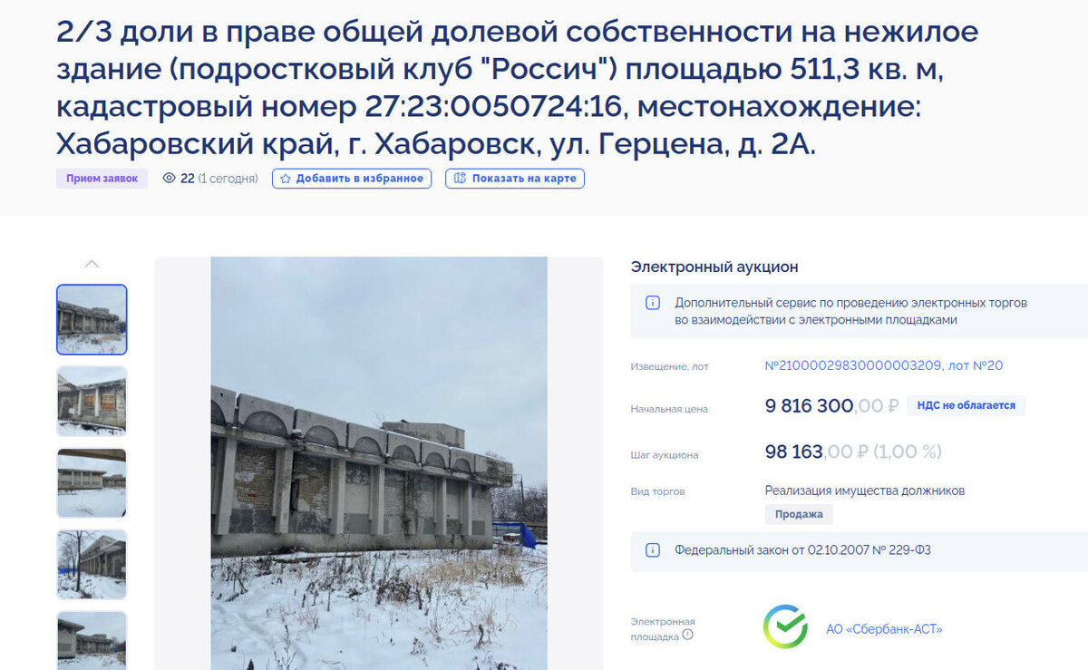 Заброшенное бункероподобное сооружение у популярного места отдыха хабаровчан, известного как озеро Рица, на Герцена 2а, арестовано за долги и выставлено на продажу. Правда, не все. - 2/3 доли в праве общей долевой собственности на нежилое здание (подростковый клуб "Россич") площадью 511,3 кв. м. Начальная цена - 9 816 300 руб., - говорится в объявлении о торгах. Организатор торгов — Росимущество. Основание — постановление судебного пристава-исполнителя о взыскании задолженности с физического лица. Как следует из документации, здание принадлежит на праве общей долевой собственности двум гражданам, проживающим в Хабаровске и Хабаровском районе. Отметим, что изначально и само озеро (где планировалось развитие парусного и судомодельного спорта), и вся территория вокруг него, включая ДК Судостроителей (ныне «Русь»), профилакторий (ныне детская инфекционная больница) и стадион (ныне заброшенный) принадлежало Хабаровскому судостроительному заводу. Здание довольно странной по сегодняшним мерк