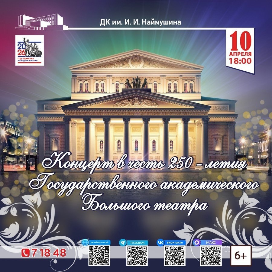 В 2026 году у театра юбилей — ему исполняется 250 лет. С момента своего основания Большой театр стал не просто сценой для великих постановок, но и настоящим духовным центром, где рождаются легенды, воспитываются поколения артистов, сохраняются и передаются сила и традиции русского искусства. Сегодня, как и столетия назад, театр остается центром притяжения для тех, кто ценит красоту, глубину и эмоциональную силу шедевров мирового наследия. Дворец культуры им. И.И. Наймушина приглашает жителей и гостей города на праздничный концерт в честь 250-летия Государственного академического Большого театра. Этот концерт станет особенным подарком театру и всем, кто его любит. Загляните за кулисы времени… Когда: 10 апреля, 18.00 Где: Концертный зал Билеты в кассе ДК, действует Пушкинская карта 6+