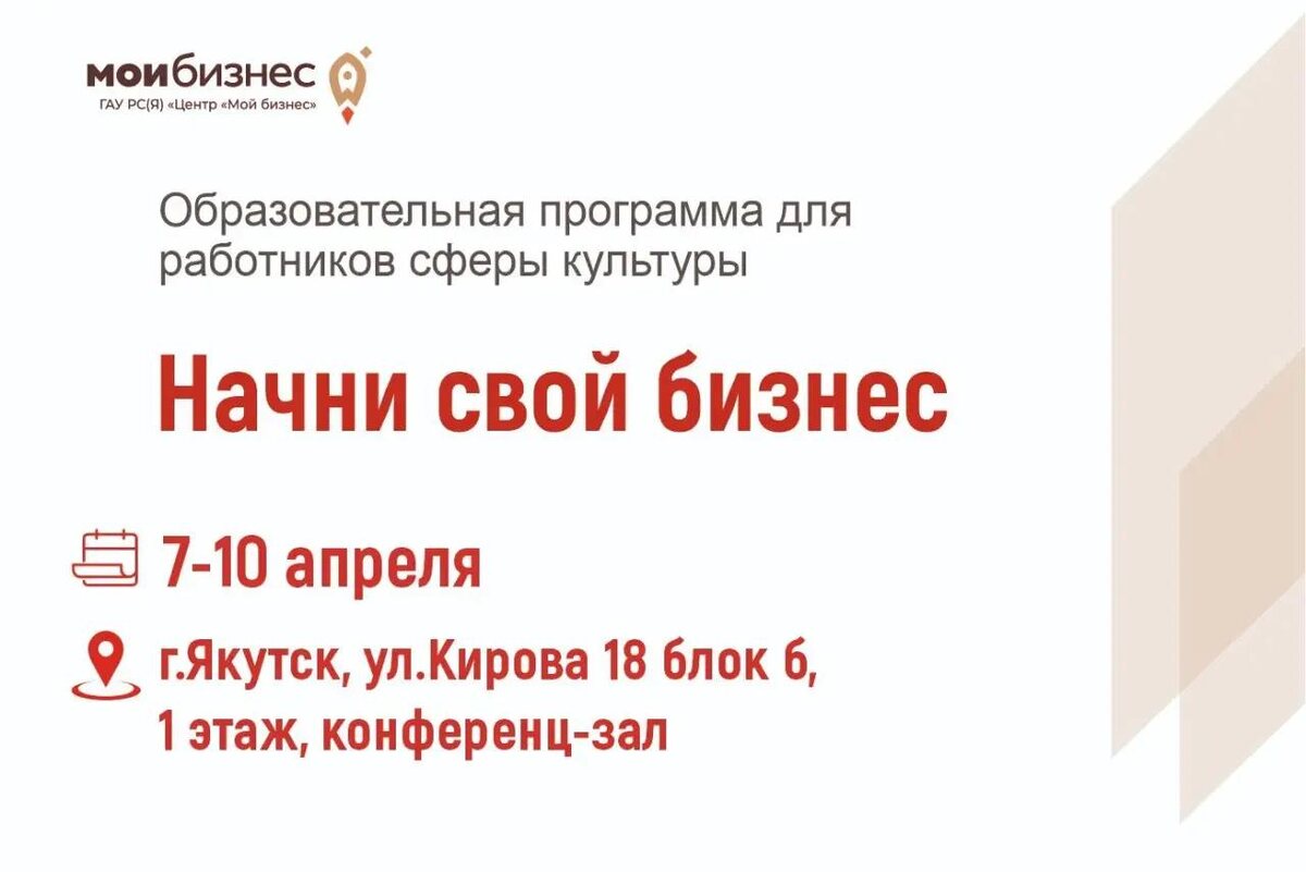 культуры. 🌟Образовательная программа предназначена для тех, кто стремится реализовать свои бизнес-идеи в области искусства, историко-культурного наследия, музейного дела и других направлений культуры. ⚡️В рамках курса вы узнаете: ✔️ Как стартовать в бизнес в современных условиях? ✔️ Статусы ведения предпринимательства в сфере культуры; ✔️Быть самозанятым или индивидуальным предпринимателем; ✔️Как выбрать наиболее выгодный налоговый режим? ✔️Финансовое планирование своего дела; ✔️Маркетинг и продвижение культурных проектов; ✔️Личные качества предпринимателя. 📆Дата: с 7 по 10 апреля, 2026 г. 🕐Время: 4 дня, 32 часа. 📍Место проведения: г. Якутск, актовый зал ГАУ РС(Я) «Центр «Мой бизнес» по адресу: ул. Кирова, 18, блок В. 🧑💻Формат обучения: очно и онлайн. 🔗Регистрация по ссылке ❓По всем вопросам обращаться по тел.: 8924-599-01-17 (МАКС) @moibizsakha
