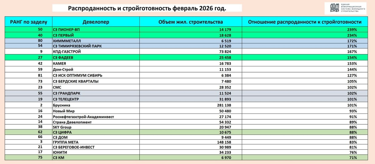 По данным агрегатора ДОМ.РФ, с декабря 2025 года соотношение распроданности к строительной готовности выросло в Новосибирской области на 1% — с 64% до 65% — но остается в зоне риска. Причины в низких объемах продаж, не смотря на активный январь. В этой ситуации в регионе идет снижение темпов вывода новых проектов на рынок. ▫️Информация о продажах в новых проектах: ✔️ «Брусника» в проекте «Город-на-озере», в простонародье «Патрики» — за 4 месяца реализовано 10% квартир; ✔️ ГК «ХИММЕТАЛЛ» в ЖК «Тимирязевский парк» — за месяц реализовано 5% квартир; ✔️ ГК «ПОЛЯКОВ» в ЖК «12 дворов» — за 4 месяца реализовано 16% квартир; ✔️ГК «КАМЕЯ» в ЖК «Счастливый квартал» — за 4 месяца реализован 21% квартир; ✔️ «ТАК» (СЗ «ГРАНДПАРК», СЗ «ТЕЛЕЦЕНТР») — в проекте «Квартал «ЩА» за 4 месяца реализовано 25% квартир. На продажи работают соотношение цены и качества, рейтинг застройщика и готовность объекта. Чем меньше готовность, тем сложнее продавать. ❗️Для застройщика важнее соотношение распродан