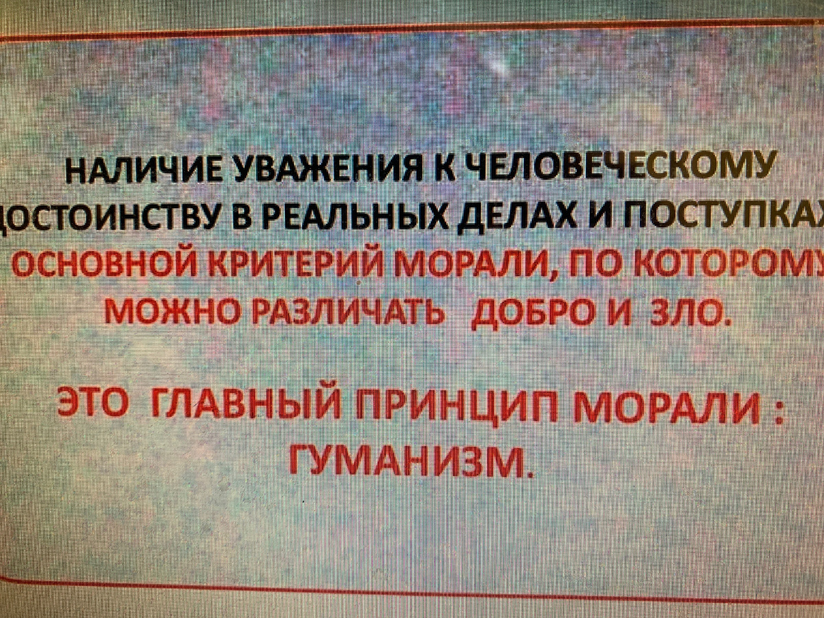 Следование общечеловеческому золотому правилу нравственности, гуманизма и социальной справедливости. Оно гласит: не делать другим то, что не хочется делать себе, и поступать с другими так, как хотелось бы, чтобы с тобой поступили то есть относиться к другим так, как к самим себе и своим самым любимым людям.