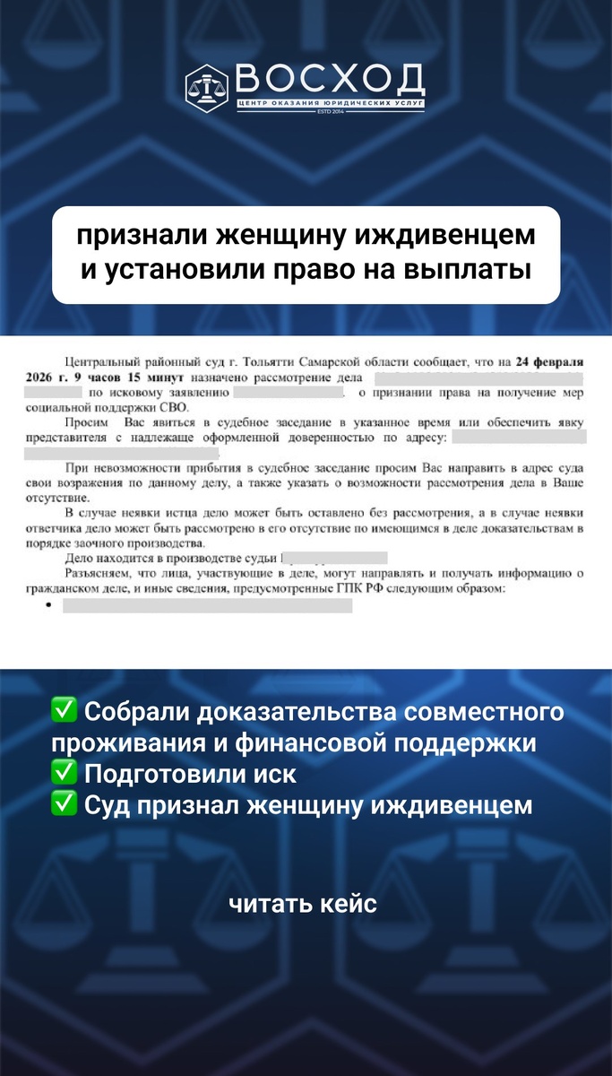 Продолжаю историю, которую начала в предыдущем посте. Наша клиентка — из Тольятти. Наш офис — в Томске. Между городами больше 3000 километров. Но это не помешало нам пройти весь путь от первого обращения до иска. Что мы сделали 🔹Проконсультировали и собрали документы. Женщина направила нам все имеющиеся документы. Мы проанализировали и отметили чего не хватает и собрали все недостающие материалы. 🔹Подготовили иск. На основе полученных материалов составили исковое заявление. Описали все нюансы. 🔹Проинструктировали по подаче. Направили информацию: куда подавать, какие копии приложить , как отслеживать движение дела. Мы все время были на связи, следили за тем, чтобы иск был принят без замечаний. 🔹Сопроводили до результата. После принятия иска мы обсудили все возможные вопросы, которые могут возникнуть в суде, подготовили доверительницу к заседанию. После чего дело было рассмотрено, а иск удовлетворили в полном объеме. Результат Женщина получила помощь в признании иждивенцем и по