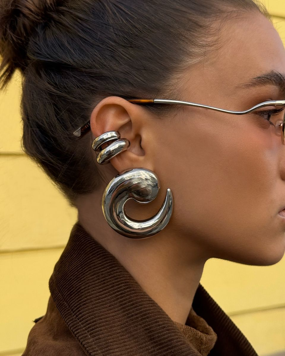 В тренде — крупные формы, но при этом максимально чистые. Гладкий металл, мягкая геометрия, аккуратные линии. Такие серьги не спорят с образом, а, наоборот, подчёркивают его и делают более цельным.