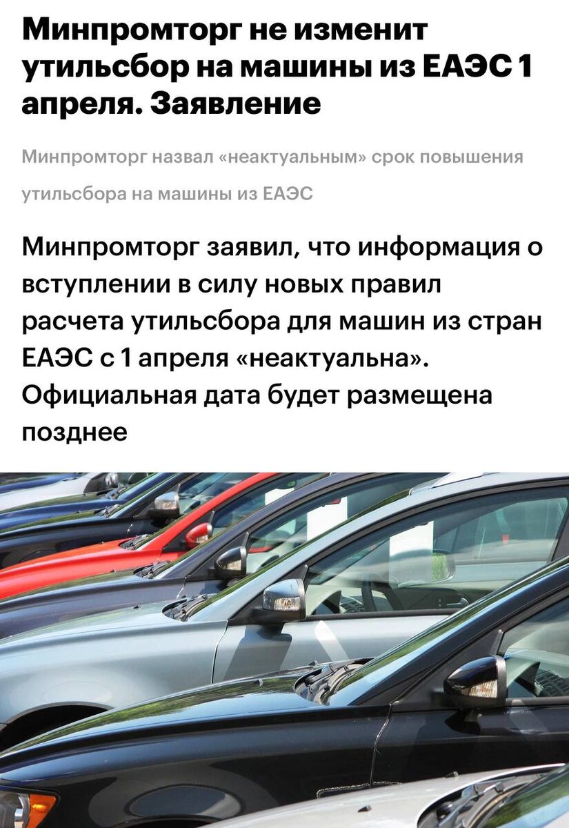 ⚡️⚡️⚡️⚡️⭐️⭐️⭐️⭐️ Минпромторг не изменит утильсбор на машины из ЕАЭС 1 апреля. Заявление Информация о вступлении с 1 апреля в силу изменений правил начисления утилизационного сбора на автомобили, которые ввозятся в Россию из других стран ЕАЭС (Армения, Белоруссия, Казахстан, Киргизия), не соответствует действительности. Об этом сообщили в пресс-службе Минпромторга. В ведомстве пояснили, что сейчас соответствующий проект нормативного правового акта проходит процедуру согласования, в том числе идет рассмотрение поступивших замечаний и предложений. Также формируется заключение об оценке регулирующего воздействия и готовятся документы для рассмотрения правительством. «Информация о дате вступления акта в силу будет размещена дополнительно, по завершении данной процедуры. В данном случае дата 1 апреля неактуальна», — заявили в Минпромторге. В феврале ведомство разработало проект, который изменяет правила начисления утилизационного сбора для автомобилей из ЕАЭС. «Интерфакс» со ссылкой на