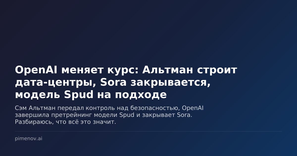 Сэм Альтман передал контроль над безопасностью, OpenAI завершила претрейнинг модели Spud и закрывает Sora. Разбираюсь, что всё это значит. На этой неделе OpenAI выдала сразу три новости, каждая из которых стоила бы отдельного поста. Но вместе они рисуют картину, которая интереснее любой из частей по отдельности. Сэм Альтман сообщил сотрудникам, что передаёт прямой контроль над командами безопасности (safety) и информационной безопасности (security). Safety переходит под руководство CRO Марка Чена, security — под президента Грега Брокмана. Сам Альтман переключается на то, что считает сейчас приоритетом: привлечение капитала, управление цепочками поставок и «строительство дата-центров в беспрецедентном масштабе». Звучит как обычная реорганизация? Может быть. Но когда CEO компании, которая делает самые мощные языковые модели в мире, говорит «я больше не занимаюсь безопасностью, я строю дата-центры» — это сигнал. Параллельно Альтман объявил, что OpenAI завершила претрейнинг (pretraining —