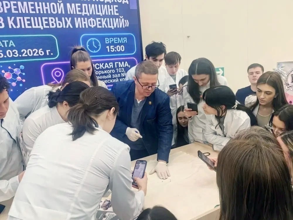 «Сезонная угроза: междисциплинарный подход в современной медицине против клещевых инфекций». К будущим врачам присоединились специалисты Центра гигиены и эпидемиологии в Амурской области Студенты представили доклады, посвящённые спектру клещевых инфекций, достижениям отечественной вирусологии и ярким клиническим случаям заболеваний, передающихся с укусом этих членистоногих Особый интерес аудитории вызвало выступление биолога Центра гигиены и эпидемиологии Романа Подолько. Он не только поделился профессиональным опытом по отлову клещей и раскрыл особенности этих малых, но грозных переносчиков инфекций, но и продемонстрировал живых особей, сделав угрозу осязаемой и наглядной В рамках конференции особый акцент был сделан на важности профилактики и ключевой роли вакцинации против КВЭ. Будущие медики пришли к убедительному выводу: вакцинация от КВЭ — это не просто формальная рекомендация, а осознанная необходимость для любого, кто живёт в эндемичном районе или чья деятельность связана с