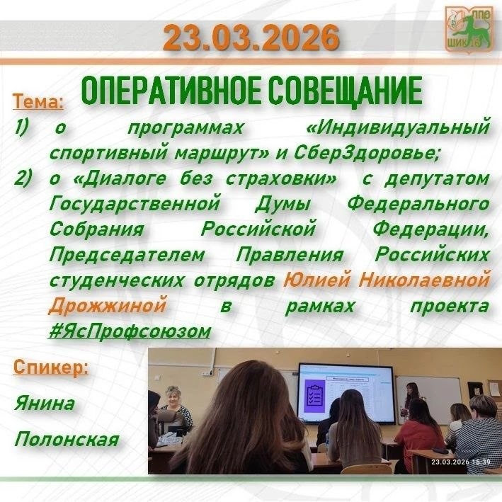 📣 23 марта 2026 года на оперативном совещании педагогического коллектива председатель ППО ГАОУ Школа «ШИК 16» Я.А.Полонская выступила перед