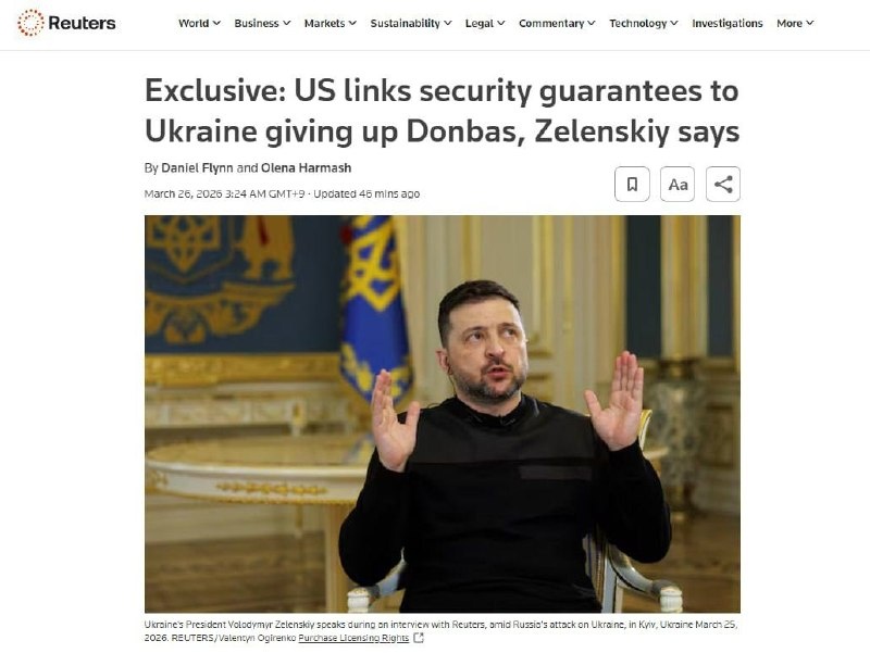 " В интервью Reuters президент Украины Владимир Зеленский заявил, что Вашингтон ставит условие: гарантии безопасности Киев получит только после вывода войск из Донбасса. Очевидно, что Трампу сейчас, точно, не до Украины. Ему бы придумать как отмыться за вранье о якобы успешных переговорах с Ираном. И явный провал в проведении быстрой победной операции. Подпишись на БородинLIVE Новости