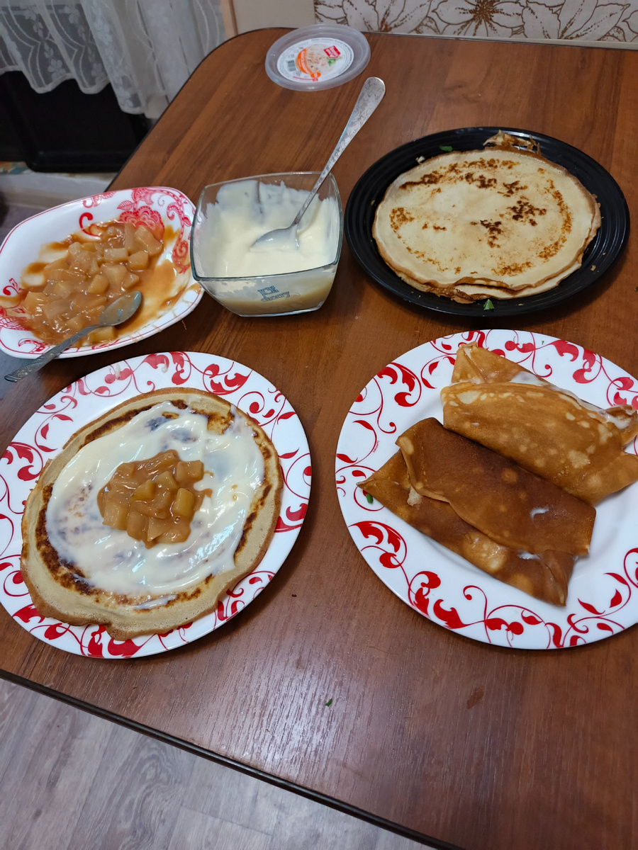 На блинчик намазать толстым слоем крем, в середину выложить ложку грушевой начинки, завернуть конвертиком.