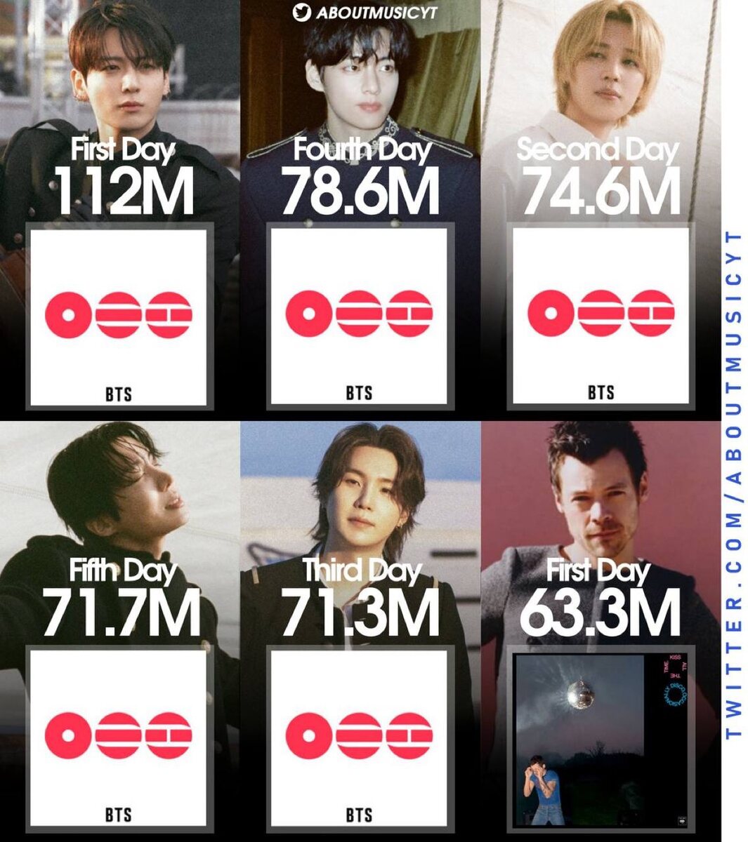 : 1. "Arirang" – 112 миллионов (первый день) 2. "Arirang" – 78,6 миллионов (четвёртый день) 3. "Arirang" – 74,6 миллионов (второй день) 4. "Arirang" – 71,7 миллионов (пятый день) 5. "Arirang" – 71,3 миллионов (третий день) cr.aboutmusicyt #BTS @kumihobts