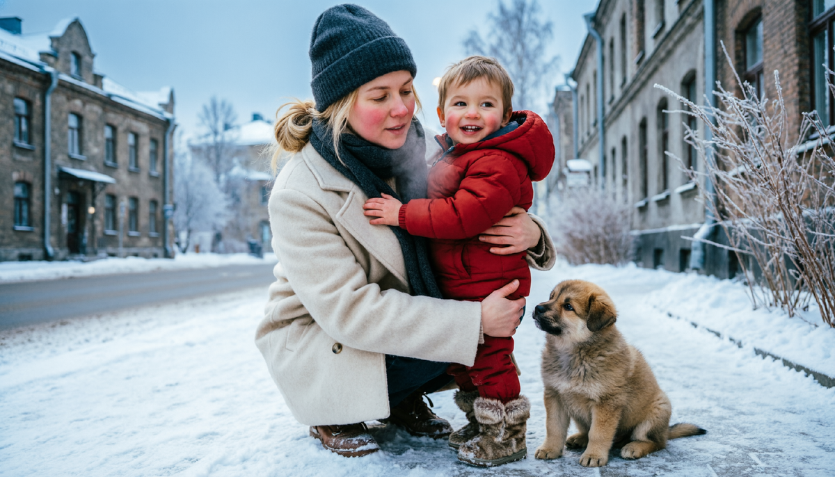 Ира стояла на обочине трассы, прижимая к груди трехлетнего сына Мишу. Мальчик, укутанный в единственный теплый шарф, который у них остался, тихо всхлипывал, пряча лицо в материнскую куртку. Его маленькие ножки уже окоченели в дешевых ботинках, промокших от тающего снега. Рядом с ними, на грязном асфальте, сидел маленький рыжий щенок, жалобно скуля и трясясь всем тельцем. Это было всё, что дал им Виктор на прощание.