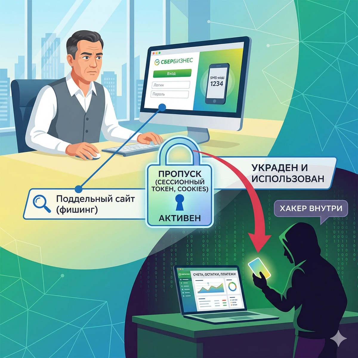 Утром открыл письмо «Подтвердите вход в СберБизнес». Привычный интерфейс, привычный логотип. Ввёл логин, пароль, код из приложения. MFA сработал. Пётр спокоен. Ничего не предвещало беды. Но сайт в письме был поддельным. Этот сайт был посредником между Петром и настоящим банком, и это и было целью злоумышленника — он сыграл роль «переводчика», передал все данные в банк и получил одну нужную ему вещь: пропуск. Пропуск — это маленький файл в браузере, который говорит сайту «этот человек уже проверен, не спрашивай снова». Его называют сессионным токеном или идентификатором сессии или cookies. Хакер забрал этот пропуск себе. Вставил в свой браузер. И оказался внутри банковского кабинета Петра — видит счета, остатки, может инициировать платёж. Без пароля. Без кода. Система видит знакомый пропуск и молчит. И это все реальные случаи, я уже рассказывал ранее насколько это частая техника у хакеров и как от нее защищать. Подробнее про более надежные способы подтверждения, что вы это вы тут