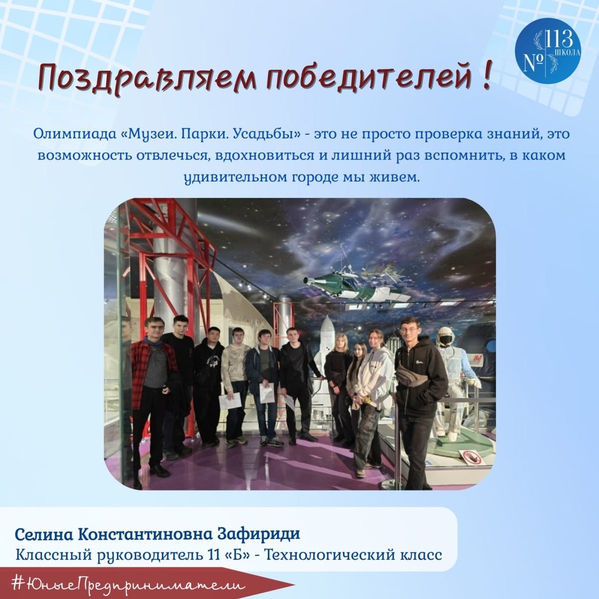 Парки. Усадьбы», которая проходит с сентября 2025 года по 31 марта 2026 года. 🙌Наши одиннадцатиклассники вместе с классным руководителем Селиной Константиновной посетили 9 объектов: 7 музеев и 2 парка. Здесь ребятам предстояло ответить на каверзные вопросы, найти редкие экспонаты, поломать голову над решением непростых вопросов о сюжетах картин, разобраться с наследственной изменчивостью и проявить настоящую командную работу. 🔥Для нашего 11 класса участие в этой олимпиаде — особый вызов. В плотном графике подготовки к ЕГЭ ребята нашли время, чтобы прикоснуться к культурному наследию столицы. Это не просто проверка знаний, это возможность отвлечься, вдохновиться и лишний раз вспомнить, в каком удивительном городе мы живем. 🙂Олимпиада «Музеи. Парки. Усадьбы» для нас — это традиция. И как здорово, что мы успели стать её частью даже в таком сумасшедшем ритме! #ДОНМ #Школа113 #ЮныеПредприниматели