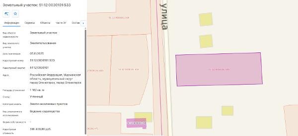 Название: Земельный участок с кадастровым номером 51:12:0030101:533, площадью 1102 кв.м., категория земель – земли населенных пунктов