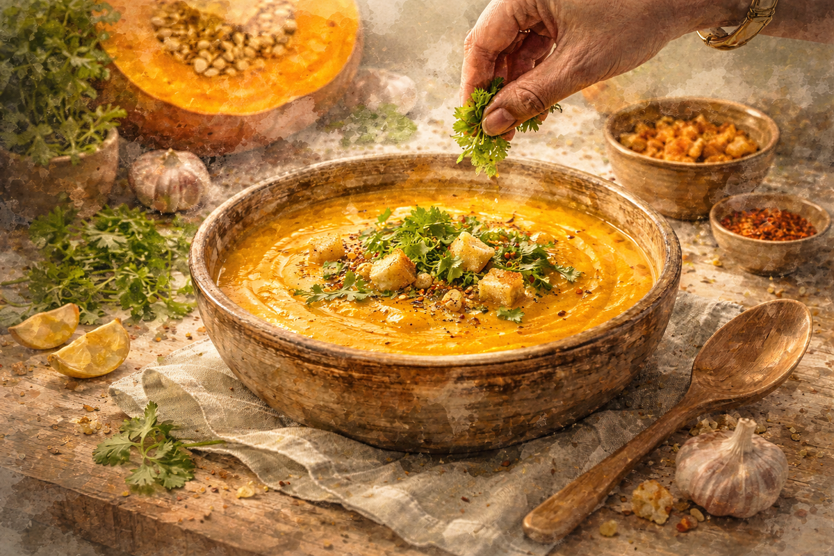 Есть блюда, которые примиряют всех. Тех, кто вечно мёрзнет. Тех, кто боится лишнего грамма. Тех, кто ест «по часам», и тех, кто успевает поесть только вечером. Для меня один из таких примиряющих рецептов — простой тыквенный суп, который мы часто даём студентам школы «Аюрведа — суть здоровья» как базовое, мягкое, но очень поддерживающее блюдо. В нём нет молочных продуктов, сложных сочетаний и странных ингредиентов. Только тёплая сладость тыквы, немного специй и вода. То, что в аюрведе называют едой, которая заземляет, успокаивает и не конфликтует ни с одной дошей при разумном количестве. С точки зрения аюрведы, тыква относится к мягким, немного сладким и тёплым продуктам. В тёплом, хорошо проваренном виде она: А главное — это тёплое, однородное блюдо. Для пищеварения это всегда проще, чем тарелка, где всё одновременно и сырое, и холодное, и жареное. Поэтому такой суп можно есть: Ингредиенты максимально простые — это принцип, которого я придерживаюсь в рецептах для студентов. Чем меньш