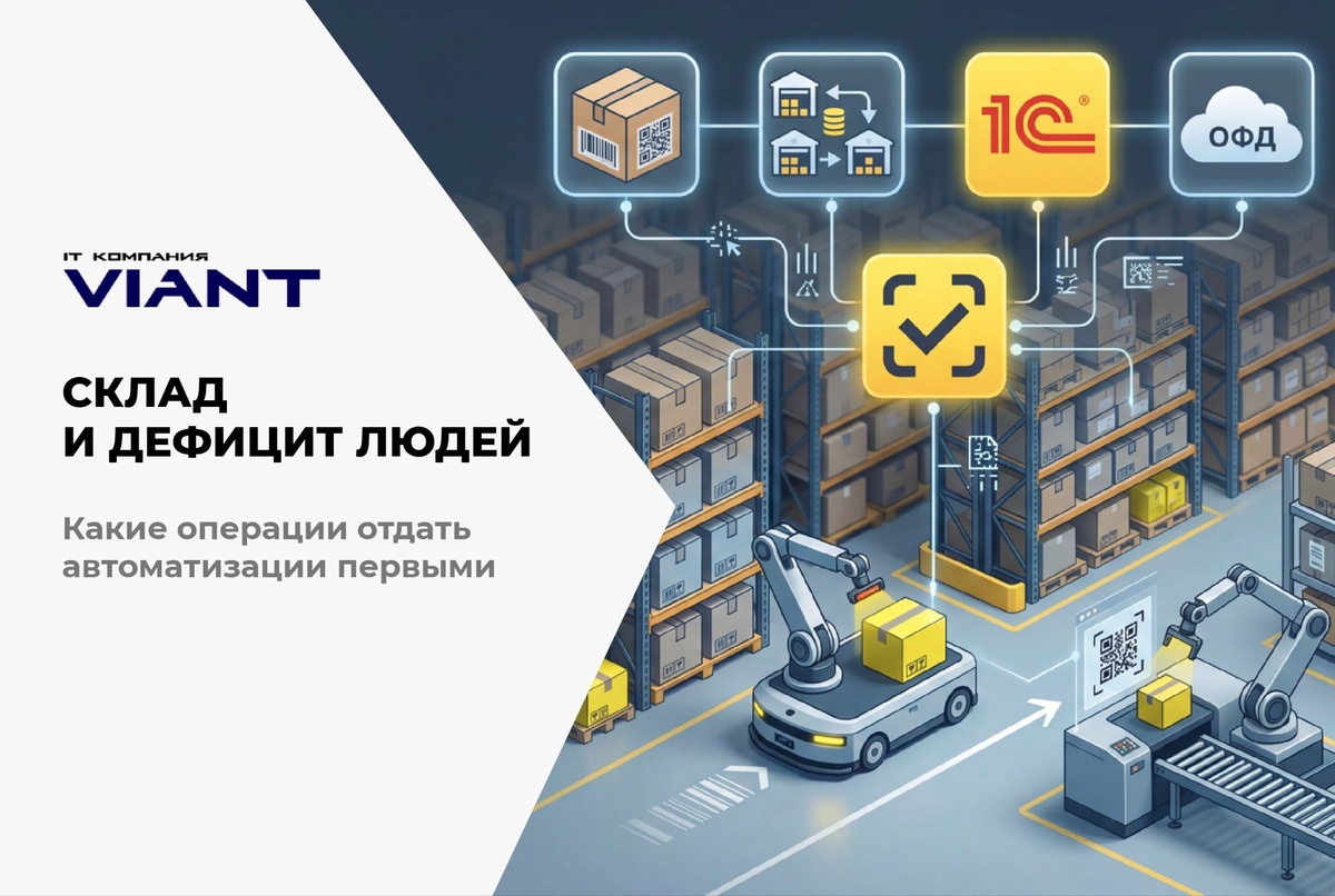 Первичная автоматизация — приёмка, пересчёт, перемещения, отгрузка — даёт эффект быстро, снижает нагрузку на персонал и минимизирует последствия даже при кадровом дефиците.