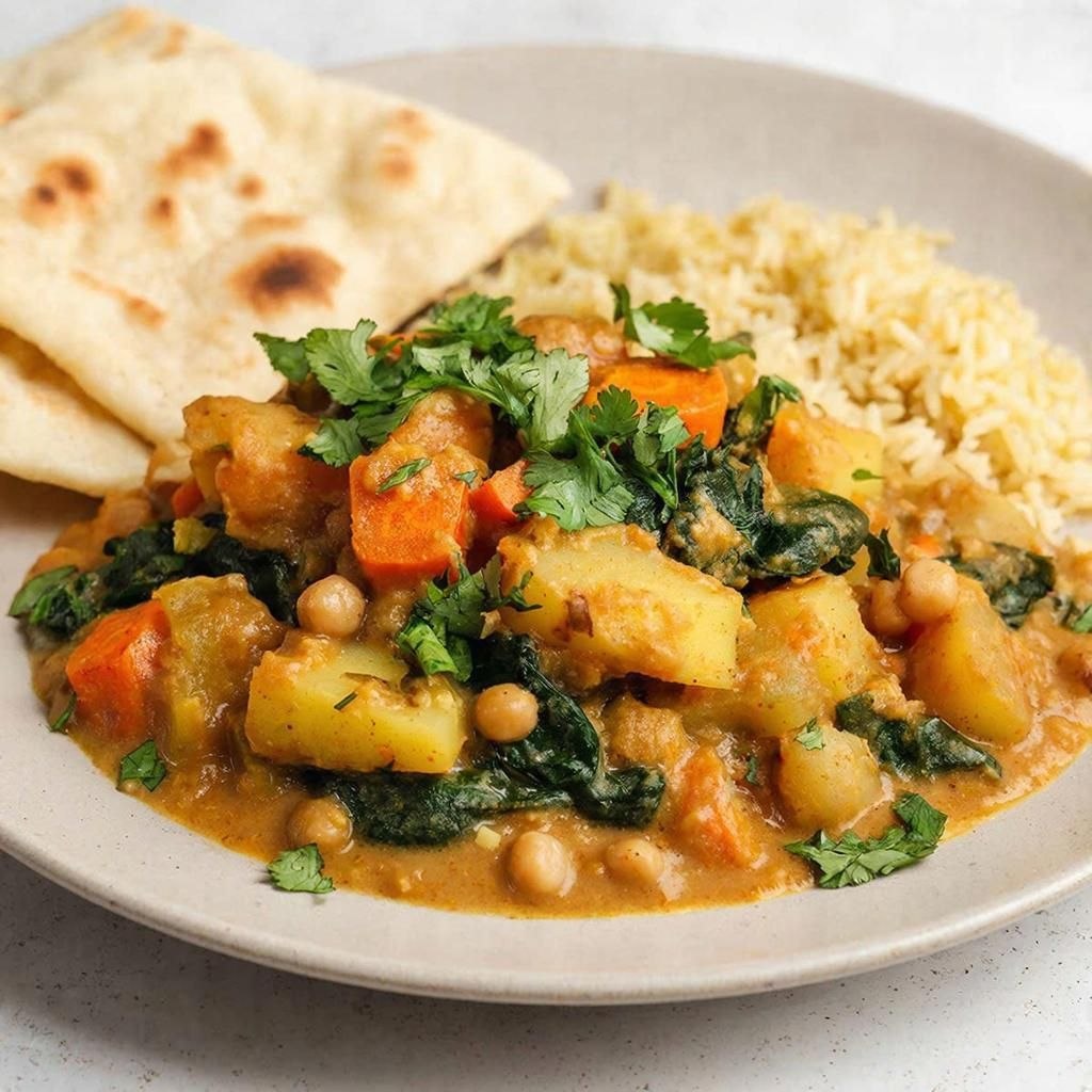 Карри без чили — для тех, кто предпочитает мягкий вкус, но не хочет отказываться от богатства специй. Овощное карри с нутом и кокосовым молоком (без чили) ➡️Ингредиенты - нут (консервированный или заранее отваренный) — 400 г; - картофель — 2 средних клубня; - морковь — 1 шт.; - цветная капуста — 200 г; - шпинат (свежий или замороженный) — 100 г; - лук репчатый — 1 шт.; - чеснок — 2 зубчика; - имбирь свежий — 2 см корня; - кокосовое молоко — 250 мл; - томаты в собственном соку — 200 г; - растительное масло — для жарки; - соль, перец — по вкусу. ➡️Специи (без острого перца) - куркума — 1 ч. л.; - кориандр молотый — 1 ч. л.; - зира (кумин) — ½ ч. л.; - кардамон молотый — щепотка (по желанию, для аромата); - карри (неострая смесь) — 1 ч. л. ➡️Приготовление 1. Нарежьте картофель, морковь и цветную капусту небольшими кусочками. Лук, чеснок и имбирь измельчите. 2. В кастрюле разогрейте масло, обжарьте лук до прозрачности, добавьте чеснок и имбирь, готовьте ещё минуту. 3. Всыпьте специи