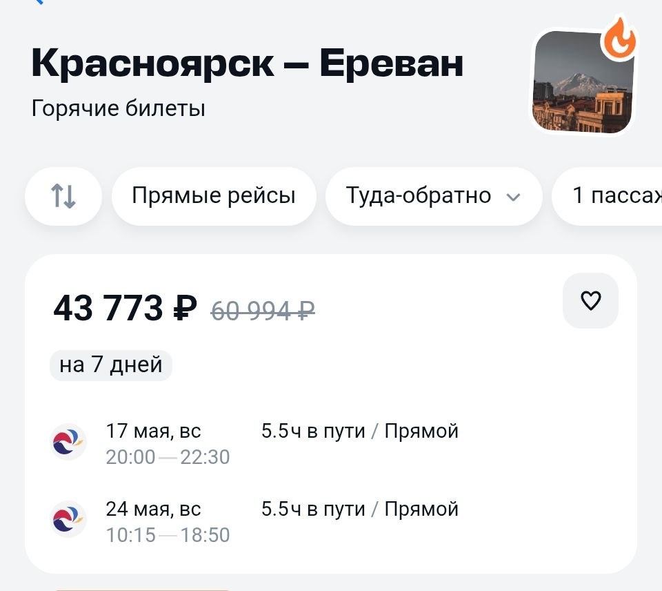 Напоминаем про прямые рейсы в Ереван из Красноярска. И ценник на май туда такой 🙄