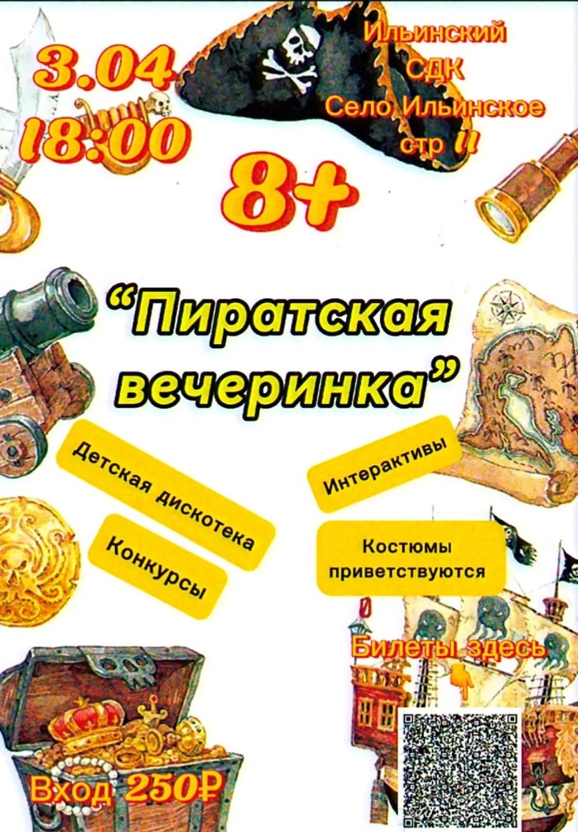 ✨ 3 апреля празднуем выход на каникулы Пиратской вечеринкой!! - дискотека - конкурсы - интерактивы - приветствуются тематические костюмы!!! 📆 03.04.2026🕒18:00 🏢 Ильинский сельский дом культуры (СДК) 📍 г.о. Домодедово, с.Ильинское, ул.Бригадная, д.11 💰 Цена: 250 ₽ ✅ Мероприятия Домодедово https://dzen.ru/id/66f10385cc4c5a16f7b5fb02 https://vk.ru/domodedovo_events http://dzen.ru/domodedovo_events