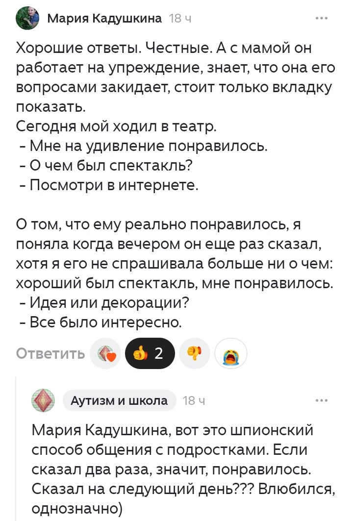 Миг (954) 1. Видела сегодня ролик, где молодая женщина лет 25 стоит перед раковиной, собирается мыть посуду и привязывает себя поводком (через пояс) к раковине. Я в начале подумала, что это она собаку привязала. Нет. Это она себя. К раковине. Текст на фоне: - Так выглядит СДВГ. Интересно. Женщина, чтобы, когда будет отвлекаться (а она будет), привязала себя к раковине, чтобы напоминать себе, зачем она здесь вообще стоит. Мысль не держится в голове? Нет способности задержать внимание на одном действии? А я на Гришу жалуюсь... --- Я как-то видела высказывание нашего психиатра, что СДВГ у взрослых не бывает. Если сохранились симптомы до взрослого возраста, то это уже не СДВГ, а что-то другое. 2. Под этой статьёй затронули очень интересную для меня тему. Тема того, как общаться с подростком. В нашем случае, с Гришей. Но я всё больше вижу, что есть нечто общее у него даже с нормой, а то я всё на диагнозы валю. Добавить мне нечего на тему. Разве что я часто вижу юмористические