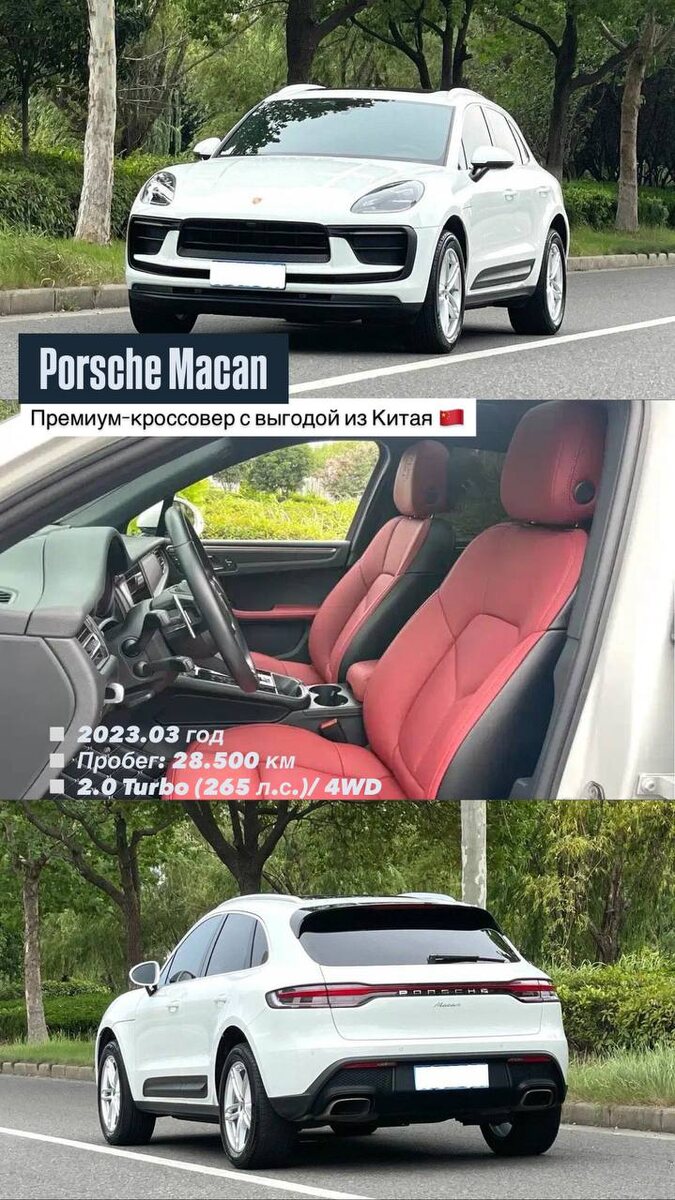 🚗 Премиум-кроссовер с выгодой из Китая 🇨🇳 Автомобиль уже завезли в Россию, прошли лабораторию и в ближайшие дни ждём погрузку на автовоз 🔥🤝 ✔️ 2023.03 год ✔️ Пробег: 28.500 км ✔️ 2.0 Turbo (265 л.с.) ✔️ Привод полный ✔️ Коробка: робот PDK ✔️ Комплектация: Macan 2.0T 🇨🇳 Сроки доставки: 6-8 недель до вашего города с момента выкупа авто