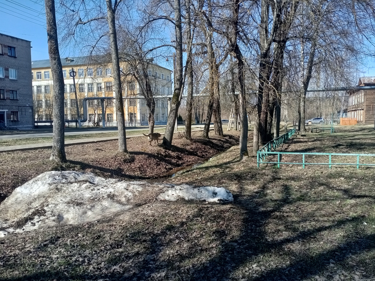 У деревца в центре - новый житель нашей улицы. Кажется, бездомный алабай. Вот где веселье...