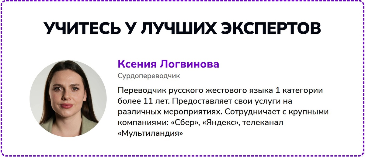 Автор курса - Ксения Логвинова, сурдопереводчик с опытом более 11 лет.