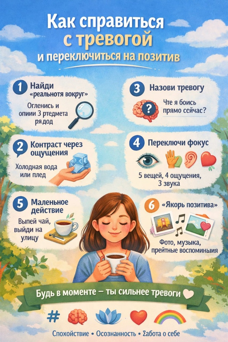 Тревога накрывает внезапно — и кажется, что выбраться из этого состояния невозможно. Но хорошая новость в том, что мы можем мягко «переключить» себя в более ресурсное состояние 🌿 Вот несколько простых, но рабочих лайфхаков: 👀 1. Найди «реальность вокруг» Оглянись и назови вслух или про себя 3 предмета рядом с тобой. Затем добавь детали: цвет, форма, текстура. Это помогает мозгу выйти из тревожных фантазий и вернуться в настоящий момент. 🧊 2. Контраст через ощущения Умойся прохладной водой, подержи в руках что-то холодное или, наоборот, укутайся в плед. Резкая смена ощущений «перезагружает» нервную систему и снижает тревогу. 🧠 3. Назови тревогу Спроси себя: «Чего я боюсь прямо сейчас?» Когда ты даешь эмоции имя, она теряет часть своей силы. 💡 4. Переключи фокус Найди 5 вещей, которые видишь, 4 — которые чувствуешь, 3 — которые слышишь. Это возвращает в момент «здесь и сейчас». 💛 5. Маленькое действие Сделай что-то простое: выпей чай, напиши другу, выйди на улицу. Действие =