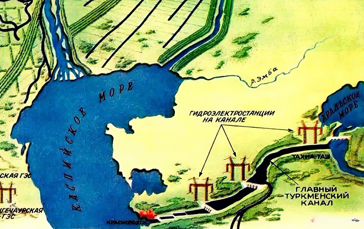Здравствуйте, уважаемые читатели! Во времена правления И.В. Сталина в СССР внедрялись проекты по преобразованию природы, которые должны были в лучшую сторону менять климат страны. Так же в СССР уделялось внимание и инфраструктуре, в частности, каналам, благодаря которым Москва стала портом пяти морей. Такими портами могли обзавестись и города Средней Азии. Итак, какую идею начали воплощать в последние годы правления Иосифа Виссарионовича? Предполагалось построить судоходный канал длиной 1100 километров от нижнего течения Амударьи до Каспийского моря по старому руслу реки Узбой, по которому Амударья ранее впадала в Каспий, а Арал сильно усыхал, в этот период, уровень воды в нем падал на 30 метров. Что из себя представлял данный проект? Это был канал шириной более 100 метров и глубиной до 7 м, для перенаправления воды планировалось возведение ГЭС на Амударье у Тахиаташа, в целом, канал должен был включать отводы для орошения земель и подпитывать около 2000 новых водоемов, по сути поср