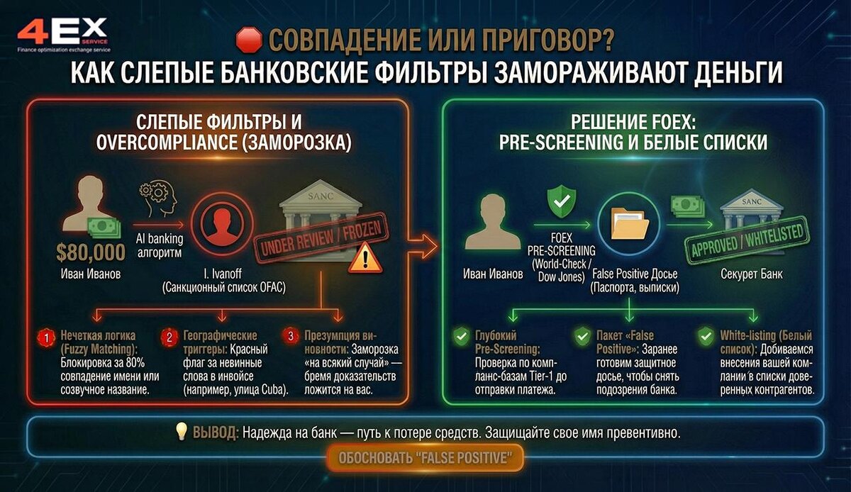 Вы отправляете $80,000 поставщику. Сделка прозрачная, товар легальный. Но банк-корреспондент блокирует транзакцию с пометкой «Under Review». Проходит неделя, и вы узнаете шокирующую причину: имя директора вашего контрагента (или даже ваше собственное) на 80% совпадает с именем человека из санкционного списка OFAC. Вы — не он. Но ваши деньги заморожены, а доказывать свою непричастность придется вам. 📉 Почему возникает эпидемия "Overcompliance" (Перестраховки)? Современные банки смертельно боятся многомиллиардных штрафов от американских и европейских регуляторов. Поэтому их системы настроены на максимальную паранойю: 1️⃣ Нечеткая логика (Fuzzy Matching): Алгоритмам не нужно точное совпадение. Если вас зовут Ivan Ivanov, а в черном списке есть I. Ivanoff — фильтр остановит платеж. Если название вашей компании созвучно с заблокированным предприятием — счет заморозят. 2️⃣ Географические триггеры: Блокировка может прилететь за слова в инвойсе, которые вообще не относятся к делу. Наприме