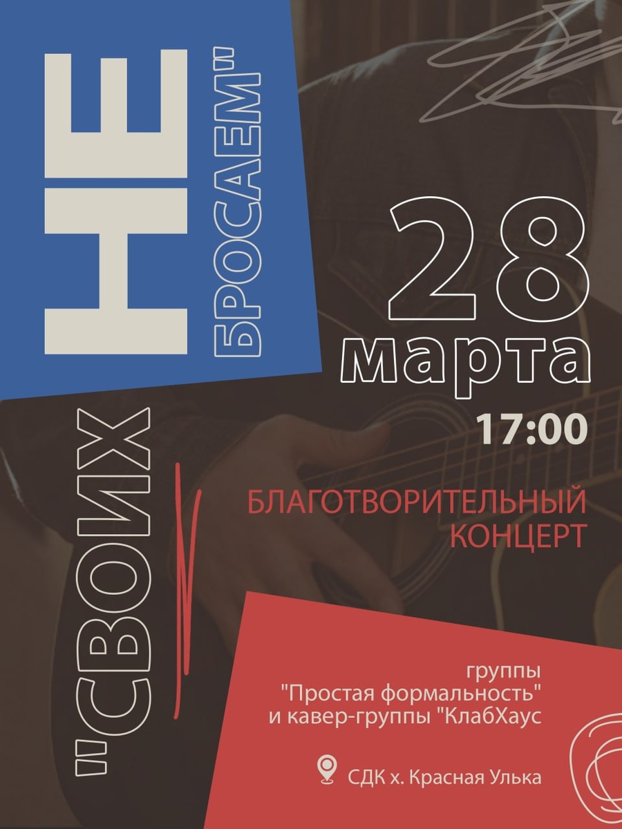 ! 🎸 28 марта, в 17.00 в сельском доме культуры хутора Красная Улька вас ждет настоящий музыкальный подарок и большое доброе дело. В этот вечер выступят две классные команды: 🎤 Группа «Простая формальность» 🎸 Кавер-группа «Клаб-Хаус» Это благотворительный концерт. Все средства от продажи билетов пойдут на нужды СВО. Организаторы планируют приобрести колесо для УАЗа. Эта машина ежедневно помогает спасать жизни, эвакуируя раненых с поля боя. 🎫 Цена билета — всего 100 рублей. Не бывает маленьких дел, когда речь идет о помощи. Давайте соберемся вместе, отдохнем под живую музыку и поддержим тех, кто сейчас нас защищает!