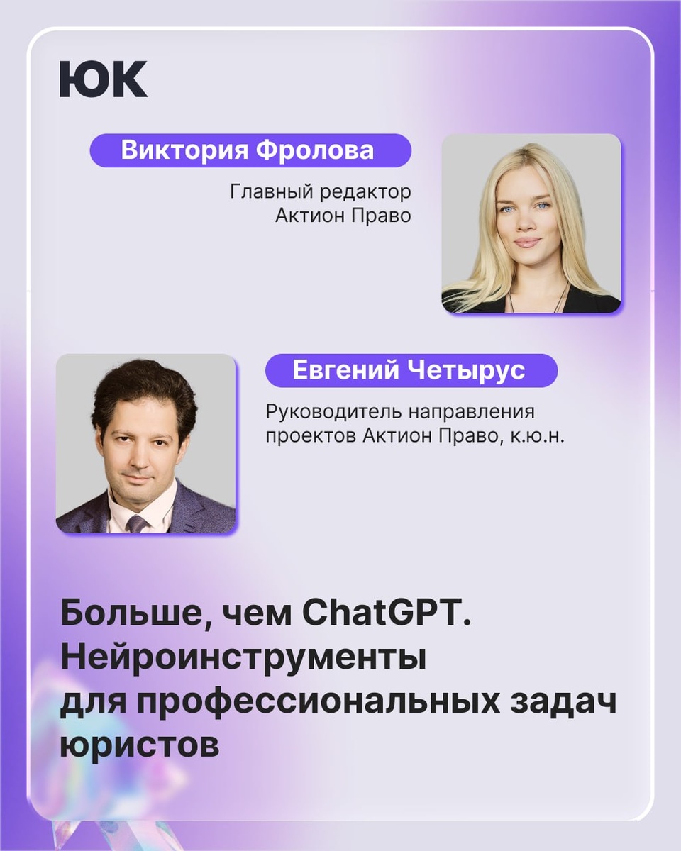 Нейроинструменты для профессиональных задач юристов» уже началась. Подключайтесь! ChatGPT — только верхушка айсберга. Разберем, какие нишевые специализированные AI-сервисы для юристов сегодня есть на рынке, и для каких задач они подходят уже сейчас. 🎙 Спикеры: Виктория Фролова, главный редактор Актион Право и Евгений Четырус, руководитель направления проектов Актион Право, к.ю.н. Подключиться ➡️