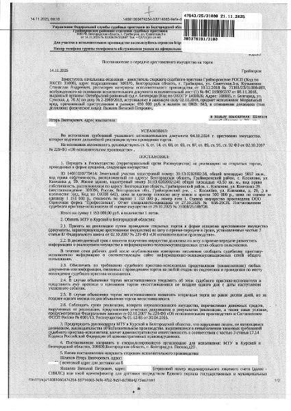 м, кадастровый номер 31:13:0202002:38. Имущество обременено: арест, запрещение регистрации. Имущество принадлежит на праве собственности Яковлеву В.П. Основание реализации: постановление о передаче арестованного имущества на торги от 14.11.2025 №31008/25/202887 Грайворонское РОСП Канал: Госземля Белгородская область Область: обл Белгородская р-н Грайворонский Район: с. Косилово Населенный пункт: ул. Кончанка, 29 Локация: Смотреть на карте ВРИ: Для ведения личного подсобного хозяйства (приусадебный земельный участок) Кадастровый номер: 31:13:0202002:38 Кадастровая стоимость: - Вид сделки: Продажа Площадь: 5057 м² Начальная цена: 980050.00 руб. Дата завершения: 27.04.2026 Подробнее: ГИС ТОРГИ #госземля #земляотгосударства #земля #земельныйучасток #земельныеторги #торги #аукцион #продажаземли #продажа #белгородскаяобласть