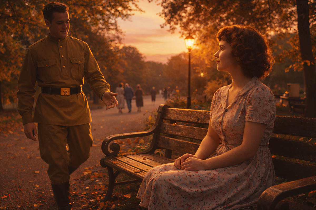 Он шёл прямо к ней. Форма сидела ладно — гимнастёрка выглажена до скрипа, сапоги начищены до зеркального блеска, в котором отражались вечерние огни. Лицо серьёзное, мужское, рано повзрослевшее. Но глаза… В них было столько тепла, столько света, столько той самой нежности, о которой она читала в книгах, но никогда не видела в жизни. У Сони перехватило дыхание.
